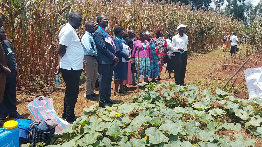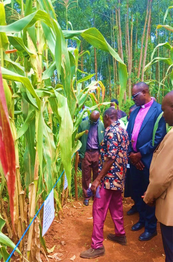 Farm school maize towering over Bishop Charles on the demo day in Kitale.